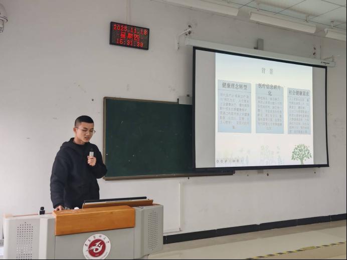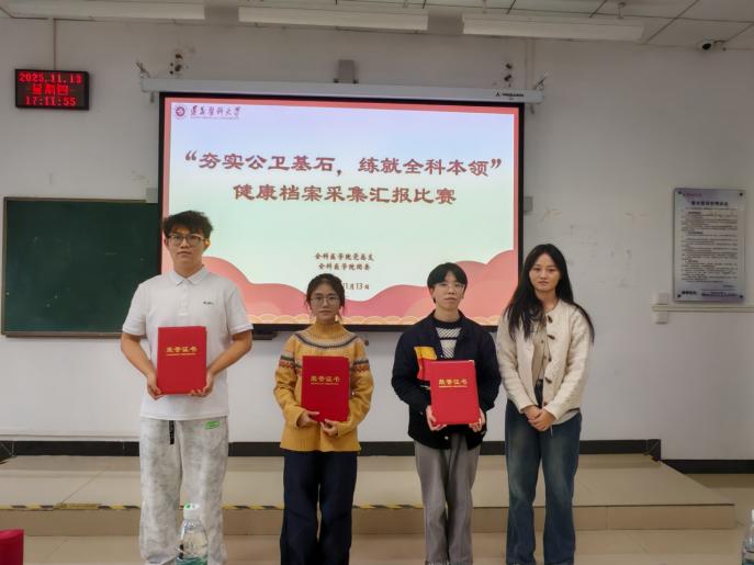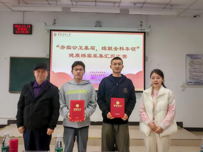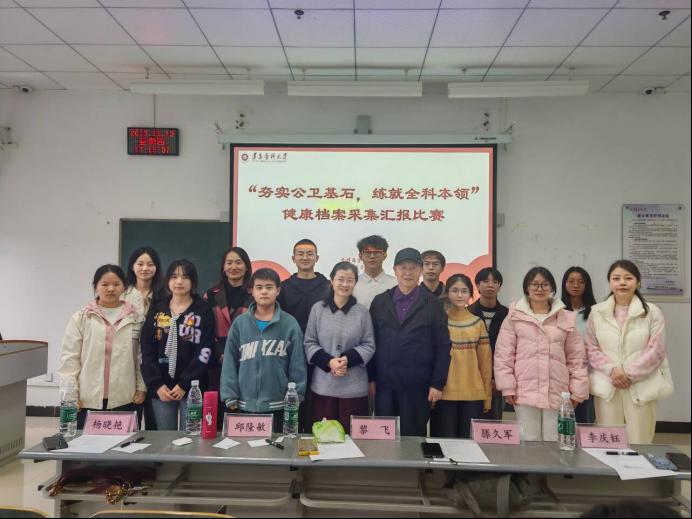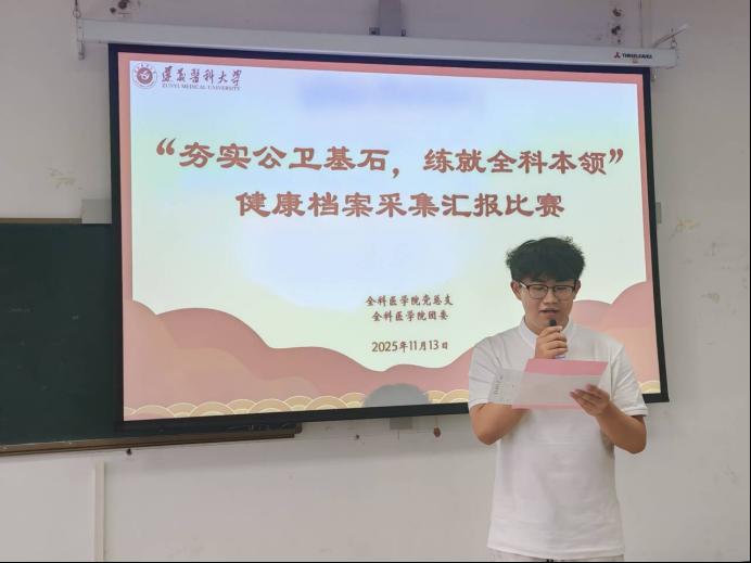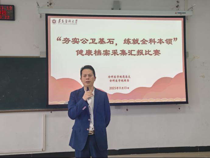 11月13日16:00,全科医学院于第一教学楼3-6A教室进行了2025年健康档案采集汇报比赛。学院党总支书记黎飞,副院长邱隆敏,关工委副主任滕久军,学生管理办公室副主任李庆钰,学生支部书记杨晓艳、陈圆圆,办公室助理陆宏亮担任评委,2024级全体同学参与。
