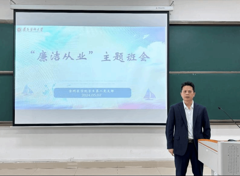 为进一步增强学院学子的廉洁自律意识,培养良好的职业道德风尚。全科医学院毕业年级于5月7日11:00在新蒲校区第38阶梯教室开展“廉洁从业”主题班会。学院党总支副书记、院长肖雪,关工委副主任滕久军,2019级全体师生参会。全科医学院党总支书记黎飞主讲。