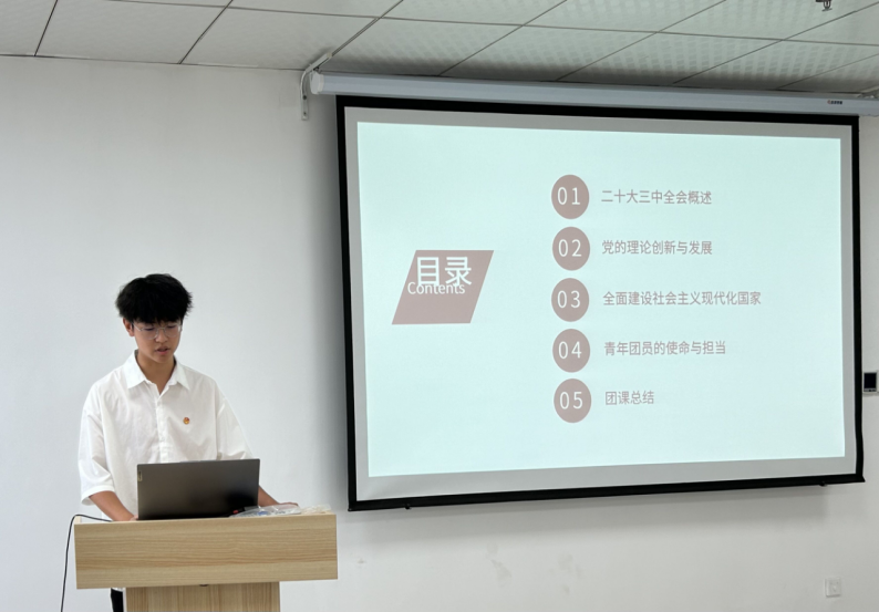 学院党总支书记黎飞讲话,他希望以此次“微团课”比赛为契机,深入学习宣传贯彻党的二十届三中全会精神,贯彻落实习近平总书记关于青年工作的重要思想,动员引领广大团员和青年认真学习领会习近平新时代中国特色社会主义思想,增强历史责任感和使命感,激发强国有我的青春激情。