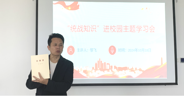 黎飞从习近平总书记的《论教育》中的“将铸牢中华民族共同体意识融入办学治校、教书育人全过程”开讲,认真学习了习近平总书记2014年在中央民族工作会议上的讲话、2019年在全国民族团结进步表彰大会上的讲话、2024年在青海考察时的讲话等。他从统战工作是“加强党和人民群众联系的纽带”、是“传播和弘扬党的理论和方针政策”、是“促进和谐社会建设的推动力量”、是“培养和造就人才的重要机制”等四个方面展开,详细讲述了统战工作的本质要求就是大团结大联合。
