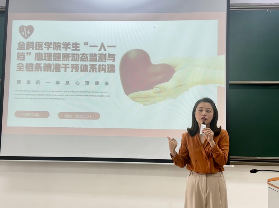 全科医学院构建学生“一人一档”心理健康动态检测与全链条精准干预体系,并逐步实现学生全覆盖,是学院党总支的研判决策,是为了学生在心理、学习、生活等方面能得到动态监测,老师及时介入,护佑学生安全成长。这项工作得到了学院师生的积极响应,此次的培训会及会后同学们按流程认真填写信息,此项工作将会很快圆满完成并产生成效。(一审:陈圆圆 二审:肖雪 三审:黎飞 撰稿:杨承艳 摄影:罗久隆)