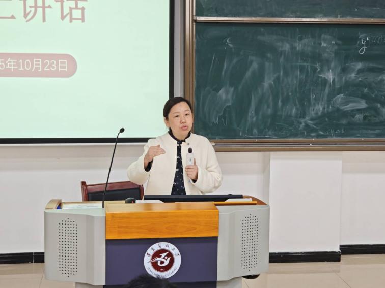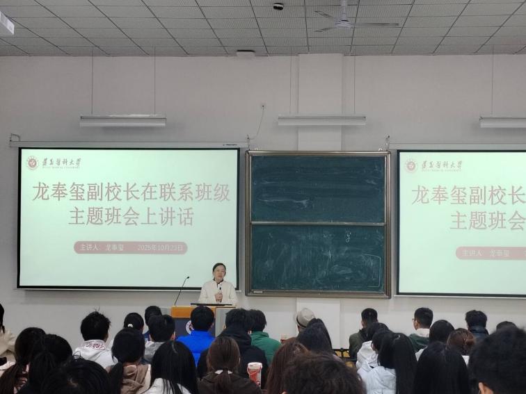 龙奉玺副校长在班会上从职业规划、体育锻炼、安全防护、学习方法优化及校园活动参与等多个方面作出指导,她为同学们的在今后大学成长提出了诸多建议与意见。
