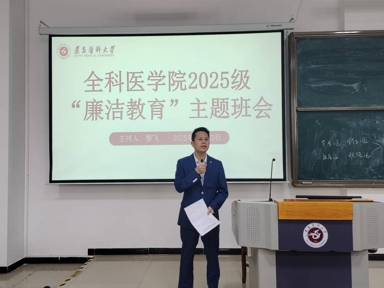 10月23日10:20,全科医学院2025级“廉洁教育”主题班会在三教29阶梯教室成功召开。学院关工委副主任滕久军及辅导员杨晓艳、2025级全体同学参加班会。副校长龙奉玺受邀出席班会并作指导,主题班会由党总支书记黎飞主持。