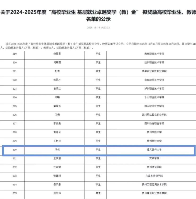 近日,教育部、中国教育发展基金会公布2024-2025年度“高校毕业生基层就业卓越奖学(教)金”名单,全省仅14位毕业生上榜。我校全科医学院2016届临床医学专业(订单定向)毕业生冯伟赫然在列,这也是我校连续三年有学子斩获此项殊荣。